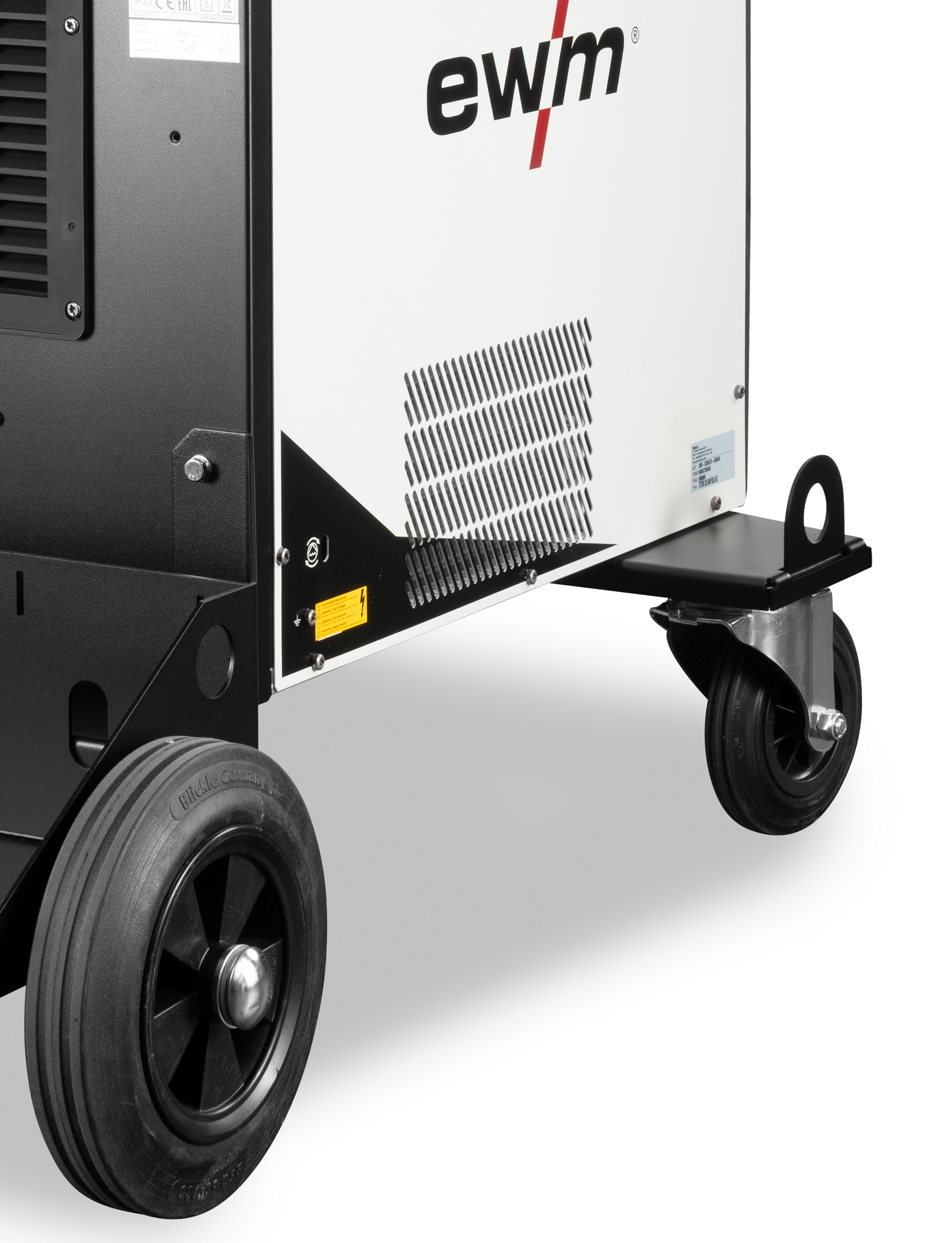 Wheels with a generous 250 mm diameter allow the welding machine to be easily moved and effortlessly overcome obstacles such as cables or thresholds. The large track widths ensure stability, even on inclinations of up to 15°.